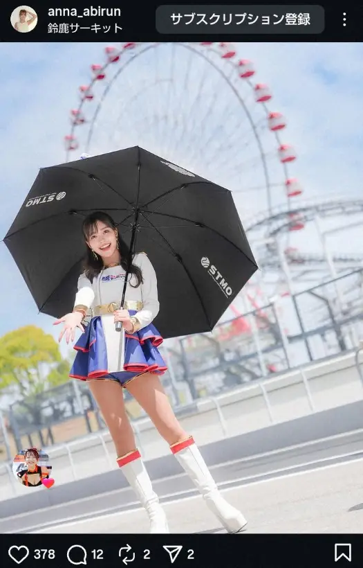 “人気レースクイーン”阿比留あんな 白&青のミニスカ・コス姿披露に「カワ格好いい」「素敵な笑顔」