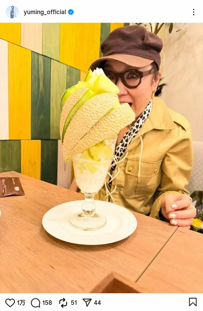 松任谷は「でっか!!!!」とのみコメント。巨大なメロンパフェを前に目を見開き、ユニークな表情で驚く姿を公開した。