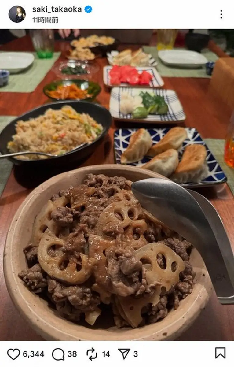 「今夜のごはん」と書き出した高岡。「息子が作ってくれた、牛肉とレンコンの梅干しと鰹節炒めをメインにチャーハンや餃子など、中華のような和食のような」とこの日の食卓を紹介した。