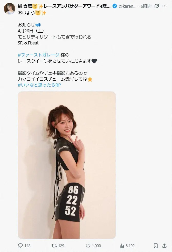 「おはよう お知らせ 4月26日(土)モビリティリゾートもてぎで行われるSFJ&Fbeat #ファーストガレージ様のレースクイーンをさせていただきます」と、スーパーFJシリーズもてぎでチーム「ファーストガレージ」のレースアンバサダーを務めることを報告。