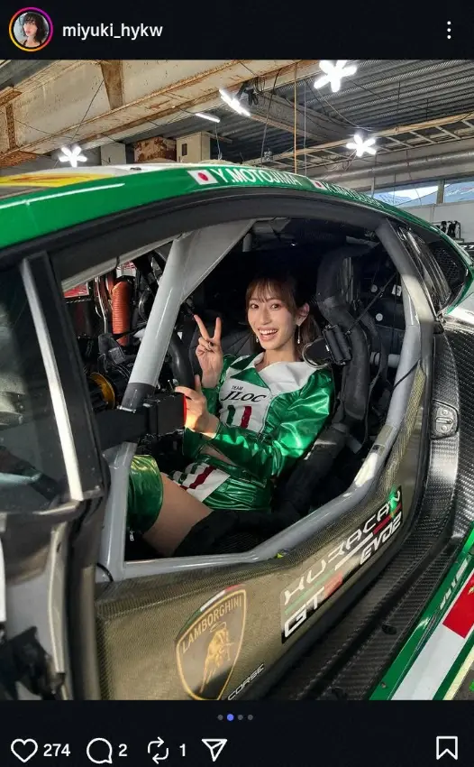 「マシンに乗せてもらっちゃった~~~」と、スーパーGT・GT300クラスに参戦するチーム「JLOC」87号車、ランボルギーニ・ウラカンの運転席にコスチューム姿で乗っている写真をアップ。