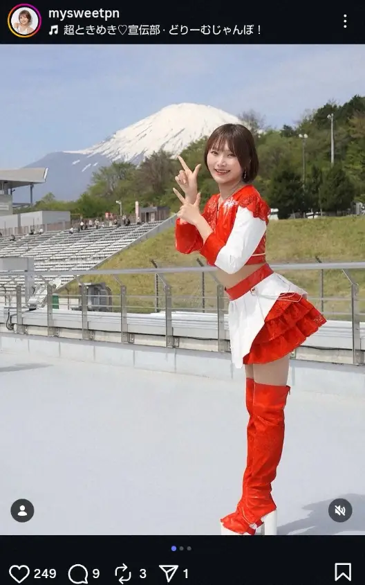 富士山を背景にした赤と白のミニスカ・コスチューム姿の写真をアップし「5/3,4は同じ富士スピードウェイでスーパーGTが開催されます」とアピール。「こちらも超絶たのしみです!一緒に22号車を応援しましょう」と、チーム・R'Qs(アールキューズ)の応援を呼び掛けた。