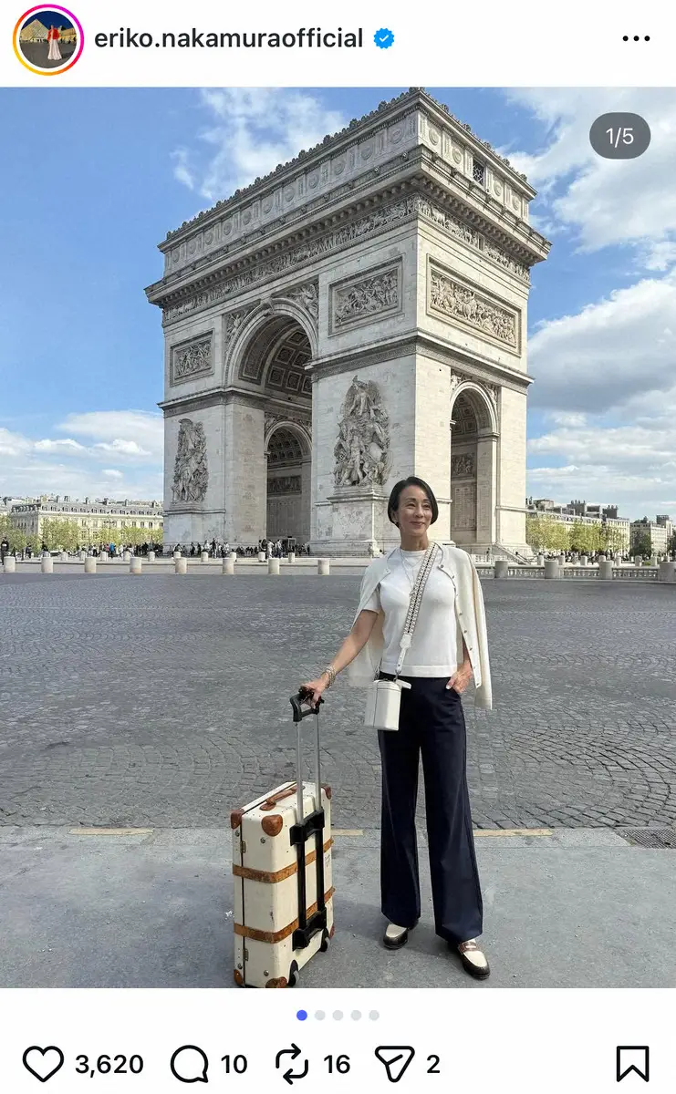 中村江里子 「パリは初夏の陽気」パンツスタイル移動コーデ 「足長い」「お美しい、スタイル抜群」の声