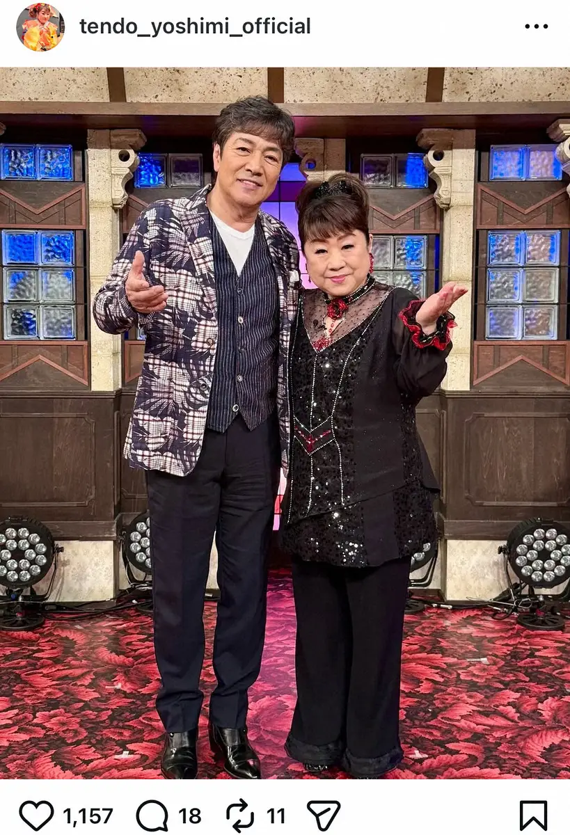 天童は「鶴瓶のええうたやなぁ 30日 BS11イレブン放送 午後8時から 野口五郎さん 天童よしみ」と出演番組を告知。共演の野口との2ショットを披露した。