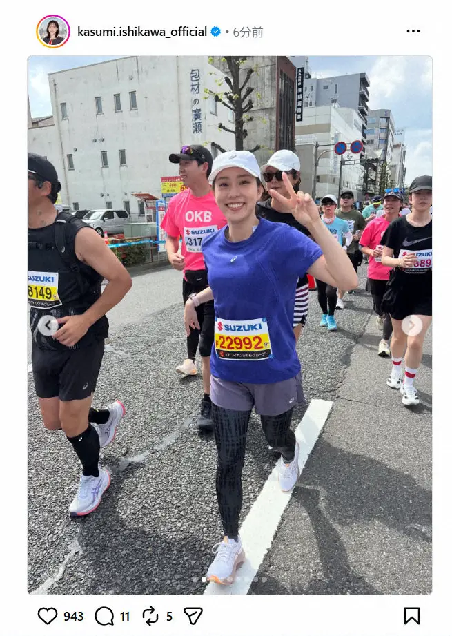 石川さんは「高橋尚子杯ぎふ清流ハーフマラソンに参加しました !初のハーフマラソン、始まる前は不安もあったのですが、完走できて嬉しいです」と明かした。