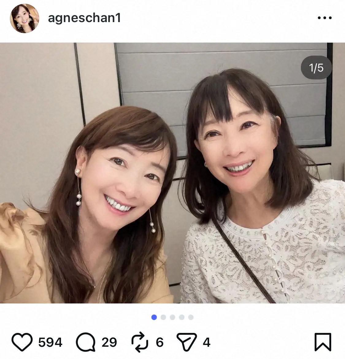 この投稿にファンからは「よく似てますね」「アグネスさんにソックリな美人さんですね」「美人姉妹」「え~っ そっくり お二人ともキレイですね~」「どっちがアグネス・チャン?そっくり!双子みたい」「2人ともお顔がそっくりですね!お美しい」などの声が寄せられ大反響だった。