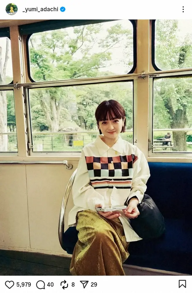 先月23日の投稿で、「イカ焼きを食す」と休日の姿を披露していた安達。この日は約1カ月ぶりの更新で「江戸東京たてもの園」とコメント。園内に展示されている都電とみられる場所での写真を披露した。