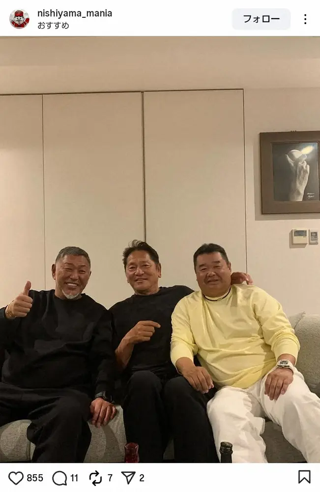 西山氏は「久しぶりに同級生のふたりと一杯やりました」と報告。西武、巨人などで活躍した清原和博氏、日米通算381セーブをマークした“ハマの大魔神”こと佐々木主浩氏との3ショットを公開した。