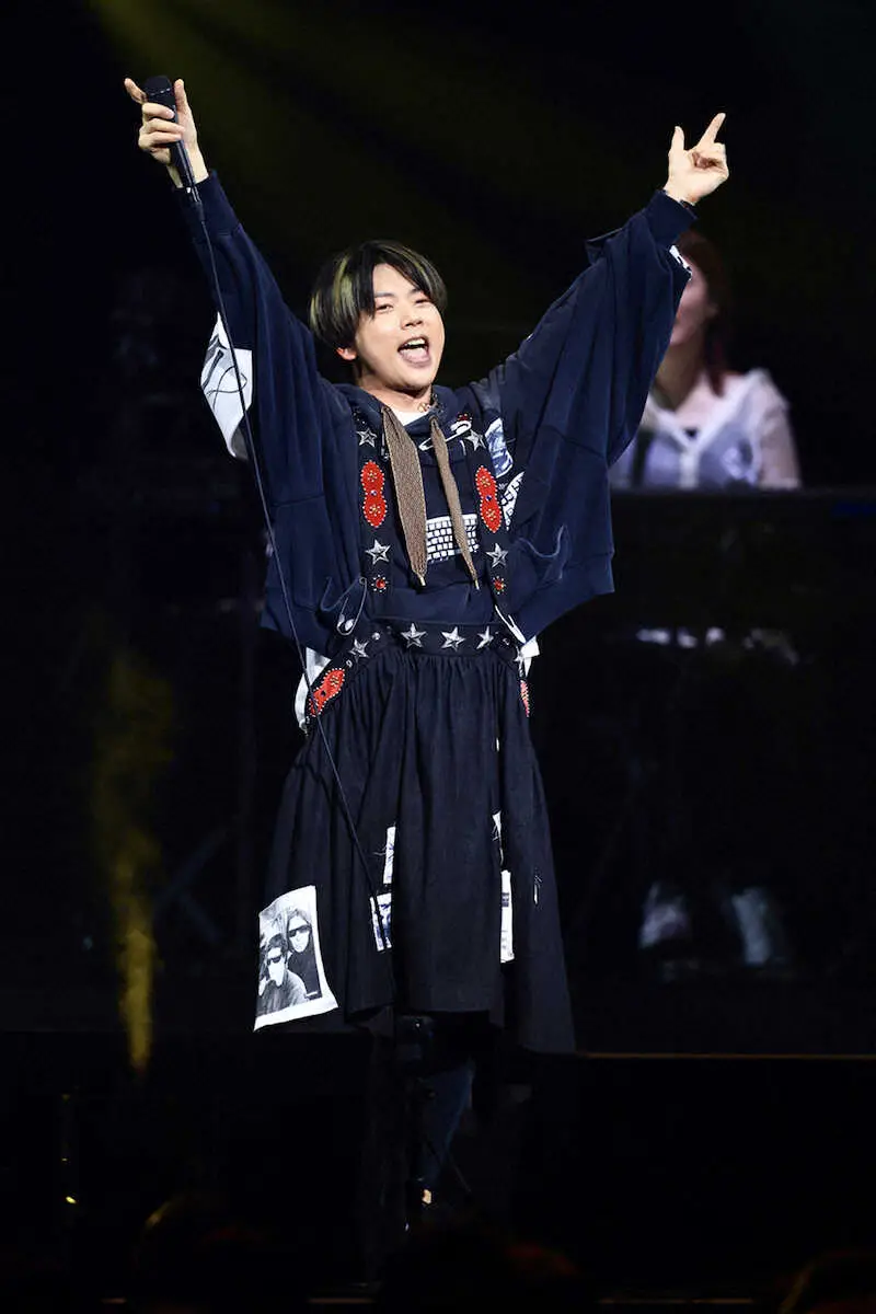 全編をプロデュース。マイク一本で戦う意志を示す、円形に並んだ約20本のスタンドマイクに囲まれながら、ソロ曲「喜怒哀楽」の力強いアカペラ歌唱で幕開け。「全身全霊で歌を届けます。一人でどんな作品がつくれるのか。挑戦します」と話した通り、トークパートなしで多様なジャンルの全21曲で魅了した。