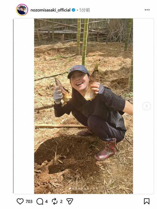 女優・佐々木希(38)が29日、自身のインスタグラムを更新。旬のタケノコ掘りを楽しんだことを報告した。