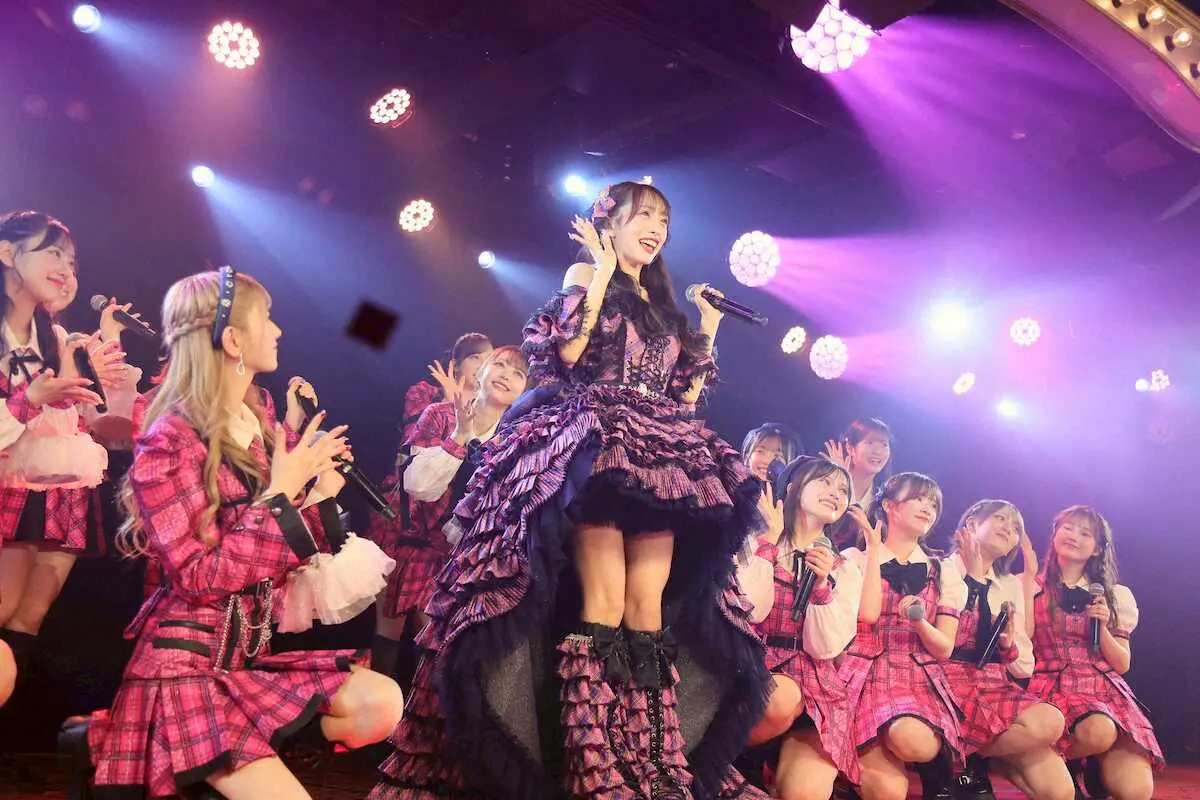 アンコールでは、ピンクと黒のチェックの卒業ドレスで卒業ソング「向かい風」や「大声ダイタモンド」を潤んだ目で歌い上げた。「一曲ずつ思い出を振り返るような感じで披露させていただきました。最後劇場での思い出、景色をメンバーと見れたらいいなと思ってこの曲にしました」と込めた思いを明かす。最後の公演を通し「やっぱり劇場が私たちメンバーにとって一番安心できる原点なんだと肌で感じることができたし、13年でこんなにたくさんの愛に出会うことができたんだなとかみしめました」と笑顔を見せた。