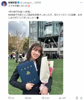 NMB48・安部若菜 「1年の休学を経て」大学卒業を報告、ファン祝福「両立すごい」「尊敬します」