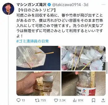 箸や竹串捨てる際の“コツ”とは「飛び出すことがあるので」ごみ清掃員芸人が紹介「なるほど」反響