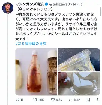 ごみ清掃芸人「食品がついたままプラ資源に出される方…ゆすいでくれると嬉しいです!」理由も説明