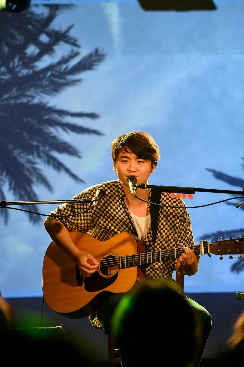 その人は穏やかな笑顔で舞台に現れた。若く初々しい雰囲気に反し、リズムマシーンを駆使しギター1本で歌う姿は、ベテランのような落ち着きっぷり。流ちょうな英語を交え歌う曲は洋楽のクオリティーだ。圧巻は、客席に下りて披露したマイクなしでの歌唱。ごまかせない状況で優しく繊細に弾き語り、本物の歌唱力と美声を証明した。
