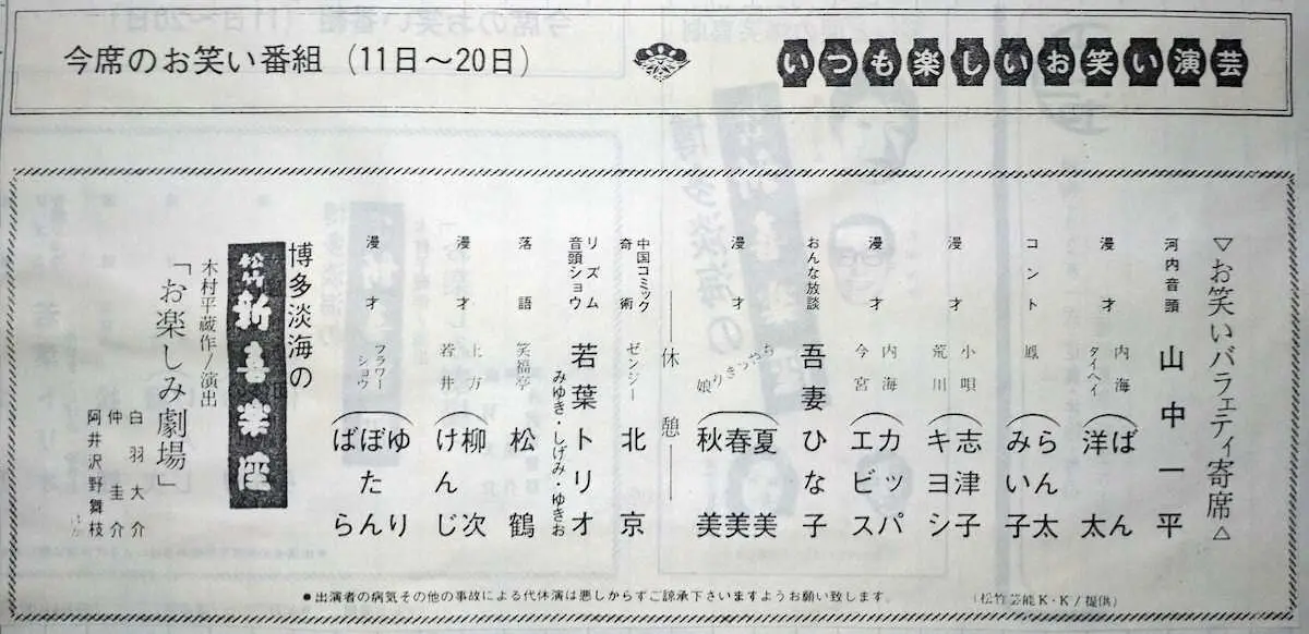 山中一平師匠のギター伴奏者で出た時の番組表 Photo by 提供写真 河内家菊水丸 「謦咳に接する」機会に恵まれた芸能人生は珍宝…人生幸朗・… ギャラリーで見る この記事のフォト 菊水丸店主 珍宝堂の写真一覧 もっと見る