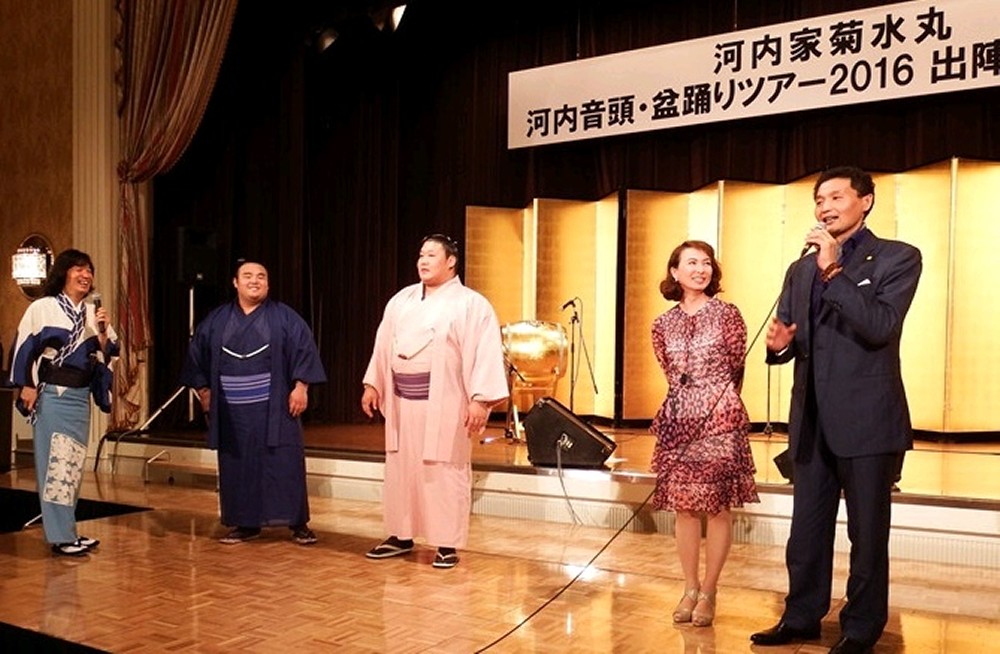 写真は「河内家菊水丸 河内音頭・盆踊りツアー2016 出陣式パーティー」でのひとコマです。右から当時の貴乃花親方、花田景子夫人、幕内の貴ノ岩関、新十両の佐藤関。2年がたち、個々に喜怒哀楽さまざまな形で今年のスポニチの紙面を飾った時の人たちと言えましょう。