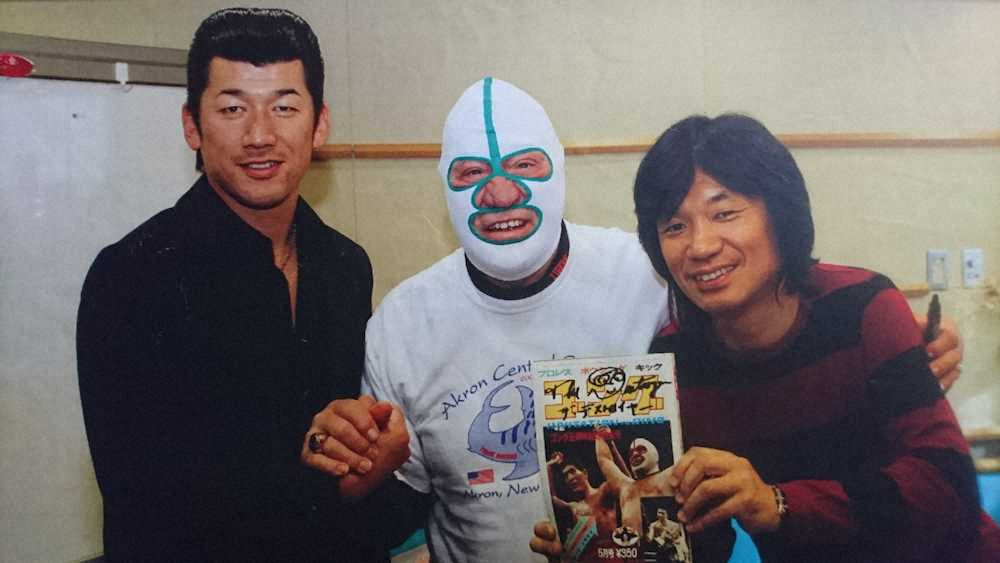 2008年(平20)12月1日、MBSラジオで担当していた「さてはトコトン菊水丸」に、力道山やジャイアント馬場を足4の字固めで苦しめた、「白覆面の魔王」ザ・デストロイヤーさんが来てくれはったのです。その日、偶然にも局内におられたハマの番長が「デストロイヤーさんのファンなんです」とスタジオへお越しになり、この珍宝スリーショットが実現しました。サービス精神旺盛な魔王は「ミスターリーゼント!4の字固めをプレゼントしてやる!」とニッコリ。