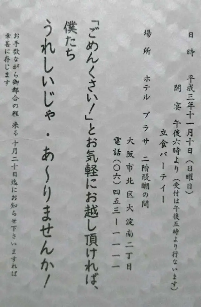 1週間後「ごめんくさい!とお気軽にお越しいただければ、僕たち うれしいじゃ・あ~りませんか!」と印刷された案内状が届いたのです(タテ写真)。当日、仲人の花紀京師匠が「菊水丸君、無料で浜のために河内音頭をすまんなぁ。で、ワシも次に結婚することがあったら、お祝いに歌ってくれるか?」と聞かれて、ひっくり返った思い出があります。