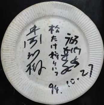 結局、その山は釜中さんの友人の持ちものと判明。すぐに連絡を入れて許可を取って事なきを得たのですが、あわやマツタケドロボーとなるところでした。記念に書いた、すき焼き鍋の皿への寄せ書きは、まさに珍宝でございましょう。(河内家菊水丸)