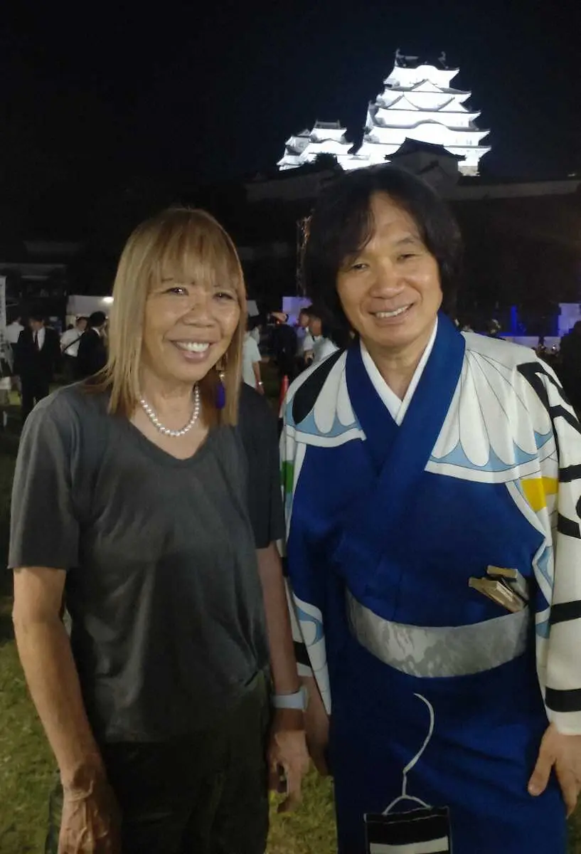 【河内屋菊水丸 珍宝堂】先月29日、姫路城三の丸広場で開催された「第41回観月会」にて、姫路ふるさと大使として河内音頭「姫路城音頭」をご披露いたしました。その会場にて、世界的なデザイナー・コシノミチコさんと久方ぶりにお目にかかったのです=写真(1)。