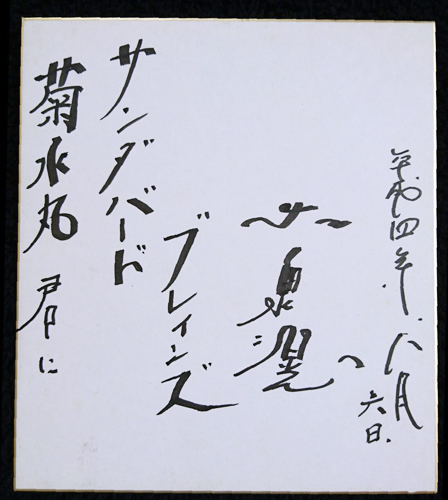 うれしかったのは、登場人物の声の出演者が同じだったこと。私が好きだったのは、サンダーバードのメカを考案設計した科学者のブレインズ。アテレコは往年の個性派俳優の大泉滉さん。今から15年程前に、私が主演声優を務めた東映Vアニメ「なにわ遊侠伝」全6作でご一緒しました。サインはその折に東京・早稲田のアバコスタジオの喫茶コーナーにて休憩時間に頂いたものです。カウンターへ並んで座り、趣味の家庭菜園について語ってくださった事を思い出します。(河内家菊水丸)