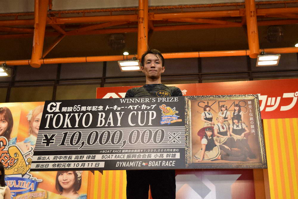 G1初優勝を達成し、表彰式で賞金1000万円のプライスボードを掲げる下手