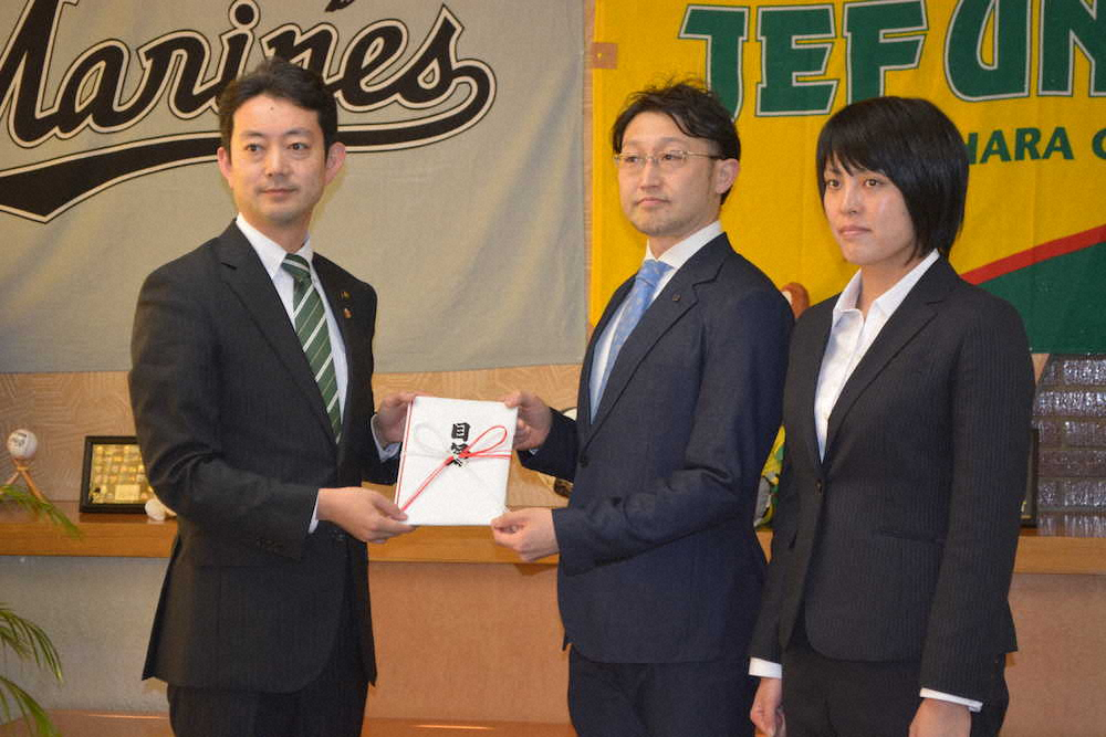 日本競輪選手会千葉支部の中村浩士支部長(41)とガールズケイリンの篠崎新純(34)が1日、千葉市役所を訪れ、熊谷俊人千葉市長に台風15号と19号で被害に遭った方々への復興支援として寄付金100万円を手渡した。