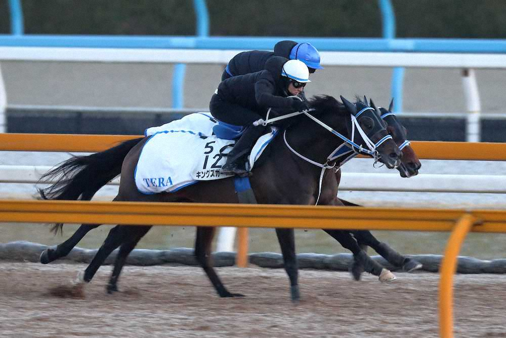 9歳の古豪キングズガードは3戦連続で騎乗する秋山がまたがり、CWコースで併せ馬。ディバインフォース(4歳2勝クラス)を5馬身追いかけ、直線は内から伸びて首差グイッと前に出た。鞍上は「チャンピオンズC(5着)の時がメチャクチャ良くて、そこまではいっていないかな」と控えめなジャッジ。コンビを組んだ近2走はともに上がり3F最速をマークしており「展開がハマるかどうか」と前崩れを願った。