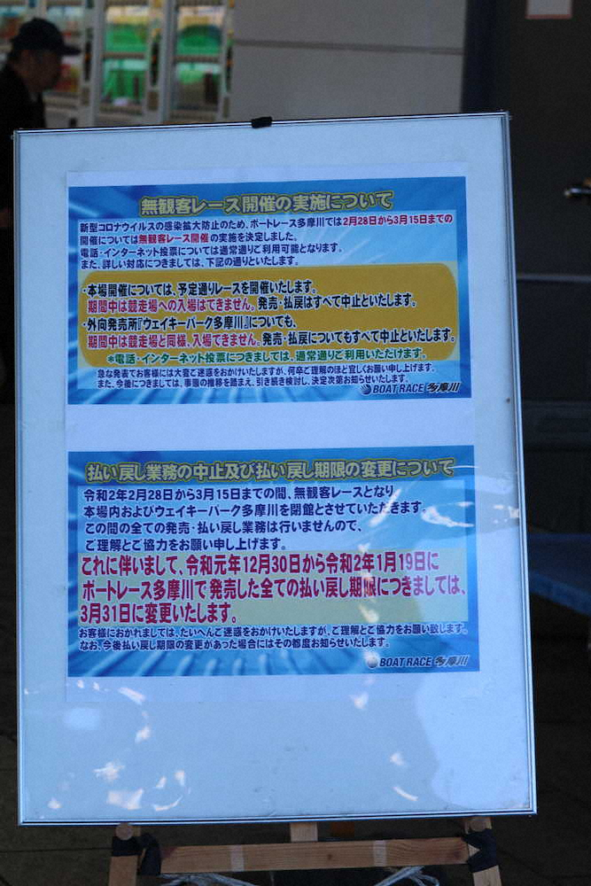 ボートレース多摩川本場の入口に設置された、無観客レース実施を知らせるボード