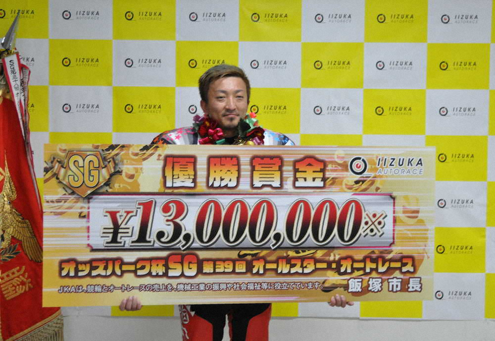 飯塚オートレース場のSG「第39回オールスター・オートレース」(優勝賞金1300万円)は29日、最終日12Rで枠番選択による0Mオープンの優勝戦(5100メートル=10周)が争われ、荒尾聡(38=飯塚)が優勝した。前回大会(浜松)以来通算4回目のSG制覇をタイトル連覇で飾った。2着は青山周平、3着は篠原睦だった。同タイトル史上初のナイター開催で行われた今シリーズ。人気と実力を兼ね備えたスターライダー荒尾の顔がナイター照明に映えた。地元SG優勝戦は過去8度の挑戦で4度の準V。「一番の念願。飯塚オートを見て育った。飯塚で獲るのが一番の恩返し」。悔しさを乗り越えて涙ぐんだ。1枠で迎えた大一番。トップスタートこそ切れなかったが「なんとかVしたい。エンジンは100点だった」。5番手から追い上げ、4周回でサトマヤ、5周回で篠原をさばいて独走態勢。Vゴールを駆け抜けた。