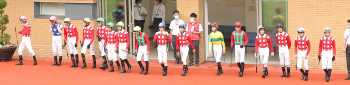 白、赤格子、赤袖の同じ勝負服がズラリと並んだ馬場入場は壮観。1、2、4、6、7枠に同居したため5種類の染め分け帽が用いられた。