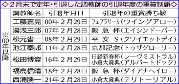 小倉では名物重賞「第55回小倉大賞典」が行われ、11番人気テリトーリアルが抜け出して重賞初V。2月いっぱいでの定年引退が目前の西浦勝一師(70)がJRA重賞23勝目をマーク。00年以降、定年引退年に重賞を勝った7人目の調教師となった。