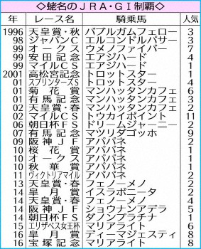 エルコンドルパサーの98年ジャパンC、マンハッタンカフェの01年菊花賞、有馬記念、02年天皇賞・春など国内ビッグタイトルを獲得。10年にはアパパネで牝馬3冠を達成した。数々の名馬とともに第一線を走り続けた“東の顔”。だが、ダービーと凱旋門賞ではそれぞれ2回の2着に泣き、あと一歩のところで苦汁もなめた。責任感の強い男が、引退の日に思い出のレースとして挙げたのは1番人気で敗れた一戦。「覚えているのは単勝1・2倍で負けたマンハッタンカフェの日経賞(02年6着)。抜け殻になったのを覚えている」と頭をかいた。