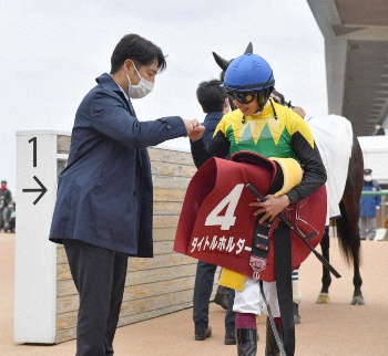 1月5日以来、今年2勝目を挙げた栗田師は、ホッとした表情だ。「うまく乗ってくれた。馬の良さはスピードの持続力。今日はそれが見えた。ここで結果を出したことは大きい」。新馬戦をスピード十分に逃げ切った。だが、逃げるだけではいつか限界が来る。我慢する競馬を教えた。気性面の改善にも着手。クロス鼻革でストレスを軽減させ、気持ちを高ぶらせなかった。全ての工夫が大物食いにつながった。
