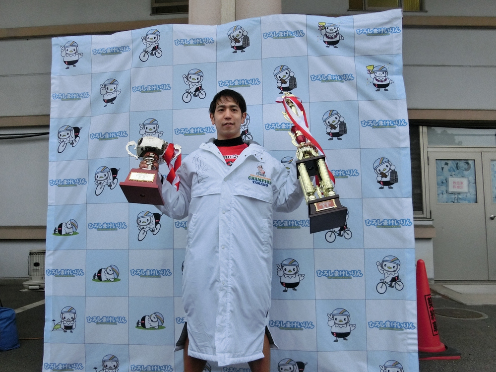 <玉野記念>優勝トロフィーとカップを手にする松浦