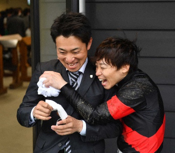 兄は喜びがあふれて笑顔で写真撮影に応じるが、弟は少しぎごちない。「硬いよ~。笑わんかい」と笑顔を引き出すのは兄の謙一だ。やっと弟の学師の表情もほころび、2人そろって笑顔になった。ヴィクティファルスで臨んだスプリングSが、兄弟で挑んだ11回目の重賞。悲願の初制覇に、兄弟は検量室前で拳を突き合わせた。調教師と騎手。父子制覇は多くあるが、年齢の近い兄弟での制覇は極めて異例。謙一は照れくさそうな弟に抱きつき、喜びを爆発させた。