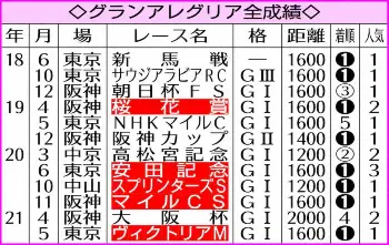 ◆グランアレグリア 父ディープインパクト 母タピッツフライ(母の父タピット)16年1月24日生まれ 美浦・藤沢和厩舎所属 馬主・サンデーレーシング 生産者・北海道安平町ノーザンファーム 戦績12戦8勝 総獲得賞金8億4903万7000円。馬名の由来はスペイン語で「大歓声」。