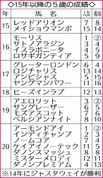 近年は若い馬の活躍が目立つ。18年以降の近3年に限れば、4歳は18年に馬券圏内を独占するなど【3・1・2・12】の好成績。5歳は【0・2・1・10】で、馬券圏内の3頭はいずれも3番人気以内だった。一方、6歳以上は【0・0・0・15】なので手を出しづらい。なお、3歳は00年以降に限ると6頭目の参戦。11年に9番人気のリアルインパクトが勝っているので軽視できない。