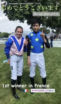 現地時間1日にエヴルー競馬場でフランス初騎乗初勝利した坂井。ミシェルは自身のインスタグラムストーリーズで坂井との2ショット写真とともに「おめでとうございます」と日本語で祝福した。