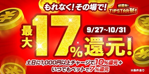 10月16日、17日はTIPマネーのチャージ&ベットで最大17%還元!「超還元!TIPSTAR祭!」開催中!