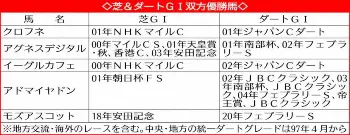 白毛馬として芝で歴史を塗り替えてきたソダシ。血統背景からはダートでも大成する可能性を秘めている。父は元祖二刀流のクロフネ、母は全4勝をダートで挙げたブチコ。吉田隼も「2歳の時からパワーもあって、血統背景からも走り方的にも面白そうだと思っていた」と話す。実際に初めてダートコースで行った2週前追いで砂6勝の先輩馬アディラート(7歳オープン)相手に手綱を持ったまま楽に先着。指揮官は「スムーズな動きを見せてくれた。適性はないっていう方ではなく、あるとみた方がいい」とダート挑戦への手応えをつかんでいた。
