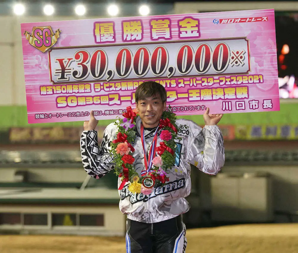 埼玉県・川口オートレース場のSG「第36回スーパースター王座決定戦」は31日、最終日12Rで王座決定戦が行われ、1号車の青山周平(37=伊勢崎)が快勝。3連覇を達成した。スーパースターは4回目、通算10回目のSG優勝を飾った。2着は黒川京介、3着は鈴木圭一郎。