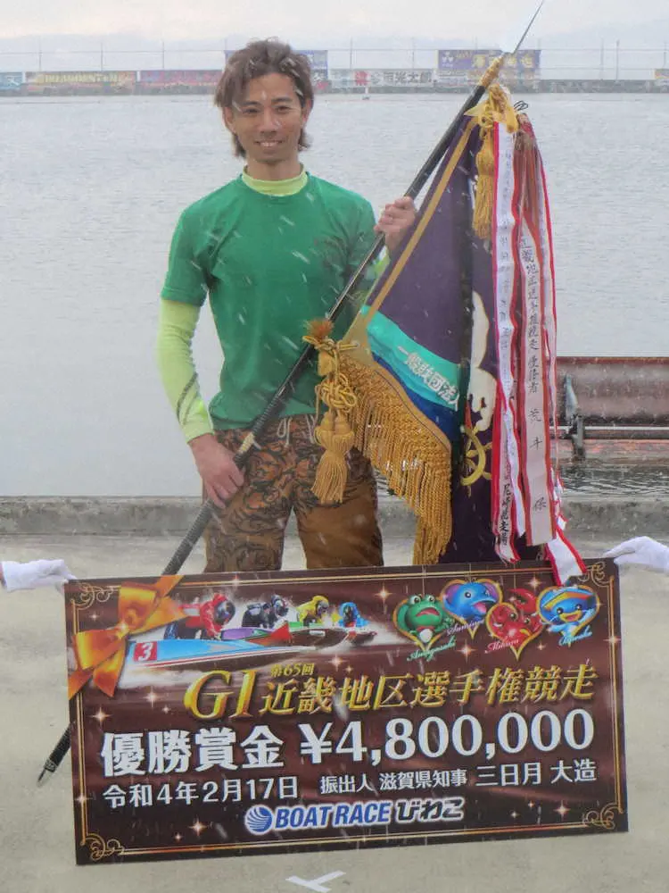 ボートレースびわこの「G1第65回近畿地区選手権」優勝戦が17日、第12Rで争われ、5コースから捲り差しで突破した是沢孝宏(36=滋賀)が待望のG1初優勝を決めた。このVでSGクラシック(3月16~21日、大村)の出場権を獲得。なお2着は石野貴之、3着は中島孝平だった。