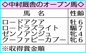 ◇中村 直也(なかむら・なおや)1978年(昭53)8月20日生まれ、大阪府出身の43歳。04年に栗東・湯浅厩舎の厩務員となり、07年から小崎厩舎の調教助手を務め、エイシンロンバード(07年武蔵野S勝ち)に携わった。「ゲートに苦労したが重賞を勝ってくれた」。20年に新規調教師免許試験に合格。