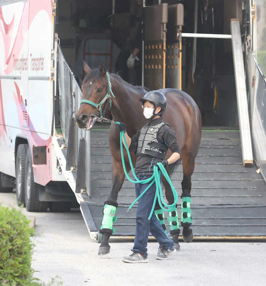 馬運車から降りるデアリングタクト(撮影・亀井直樹)