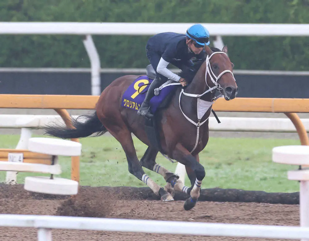タフな馬場なら出番あり。グロリアムンディは2週連続で福永が騎乗、CWコース単走で6F86秒4~1F11秒5をマーク。首をリズミカルに使い軽快に駆け抜けた。鞍上は「先週に続いていい追い切りができたと思います。トモが成長して強化されています」と好感触をにじませた。約8カ月ぶりの芝挑戦が初のG1。「良馬場の時計勝負では厳しいかな。芝でも馬場の悪い時に好走していますし、当日の天候次第ですね」と雨馬場を希望した。