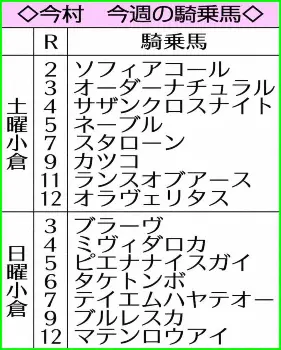 コンビ結成が決まった今村は「ハンデを背負う馬ですが乗せていただくことになり、光栄です。ありがたいです」とコメント。既にレースに向けて準備を始めている。「厩舎の方から癖はないと聞いていますし、重賞を勝たれている(鮫島)克駿先輩にも聞いてみようと思います。小倉は合うイメージですね」と意気込みを語った。