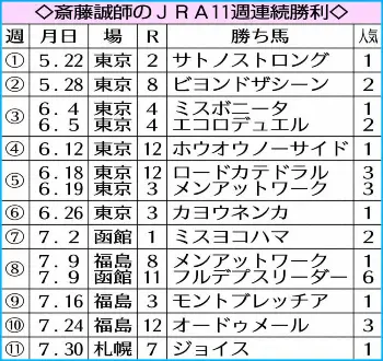 絶好調厩舎に乗れ!斎藤誠師(51)は先週土曜(7月30日)の札幌7Rをジョイスで制し、11週連続勝利を達成。JRA現役調教師では事実上“最長”(中竹師=18週=は角居厩舎から臨時の転厩馬を含んでおり参考記録)となる12週連続勝利を狙い、今週は札幌、新潟合わせて9頭の大攻勢をかける。札幌G3「エルムS」には前哨戦の好走馬を2頭出し。猛暑の夏競馬は人馬共に「調子が第一」。今週も直線を“連勝旋風”が吹き抜ける。