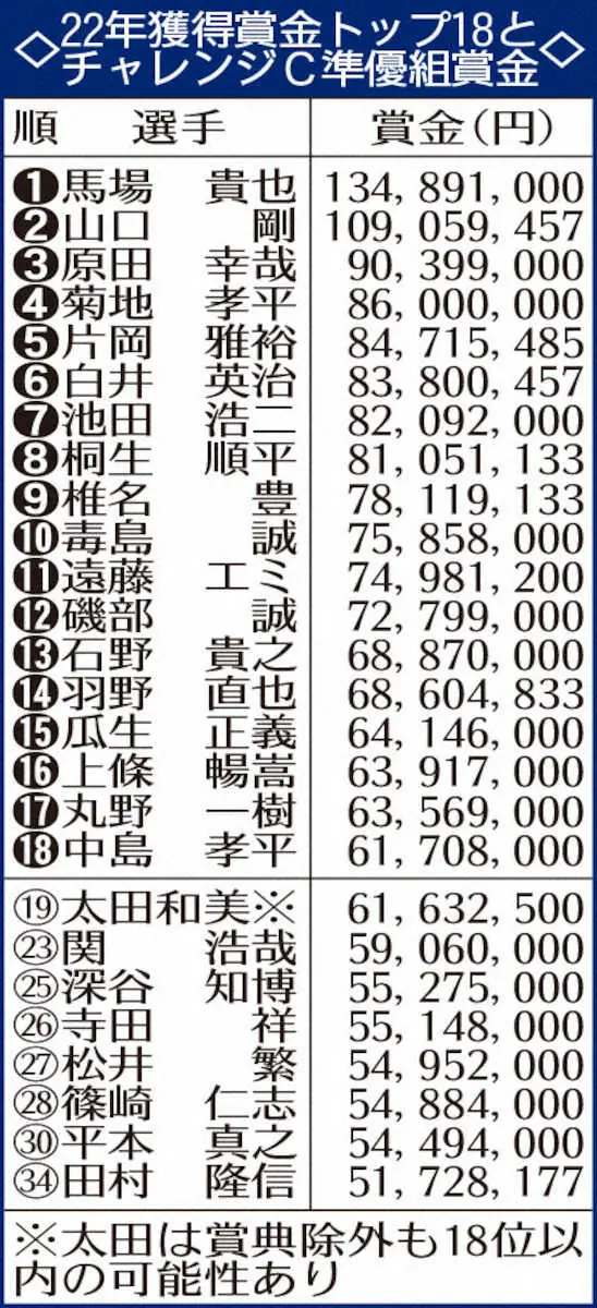 22年獲得賞金トップ18とチャレンジC準優組賞金